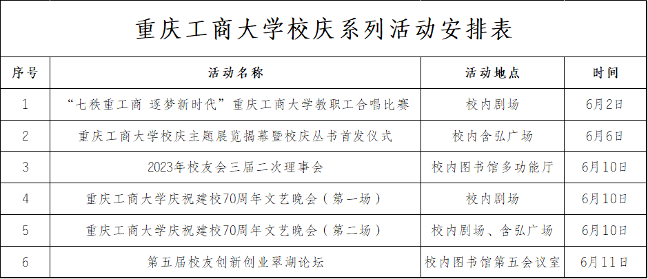 凛冬已经散去,故事仍然延续。2023年是全面贯彻落实党的二十大精神的开局之年,也是“新时代新征程新重庆”建设开局起步之年,筚路蓝缕七十载的重工商大再启新航程。6月10日,学校将举办文艺晚会等庆祝活动。届时,让我们的七秩约定在仲夏校园实现,让我们的七秩情谊在仲夏校园再续。欢言得所憩,芳华聊共挥。我们热切期盼,再聚南山之麓、翠湖之滨,畅叙深情、共绘蓝图!