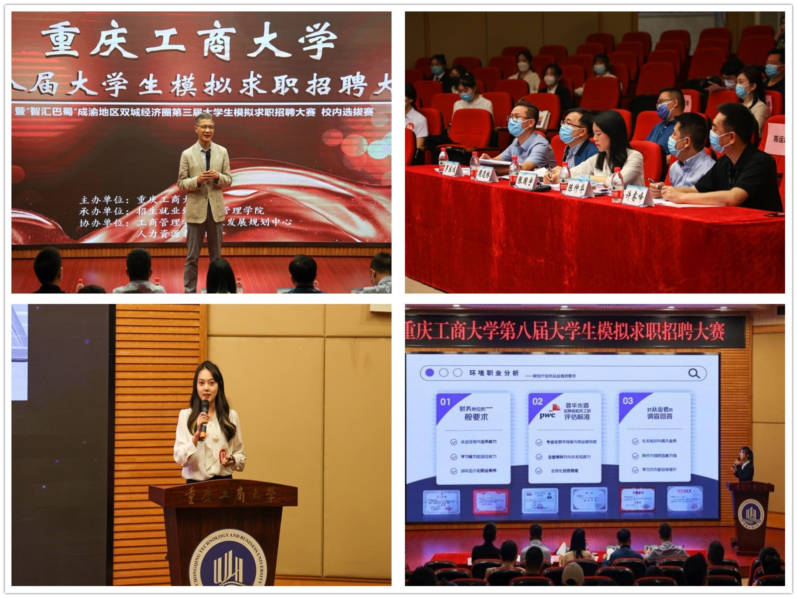 4月28日,由bat365在线中国官网登录入口招生就业处主办,工商管理学院承办的bat365在线中国官网登录入口第八届大学生模拟求职招聘大赛暨“智汇巴蜀”成渝双城经济圈第三届大学生模拟求职招聘大赛重庆赛区校内选拔赛在博智楼7200报告厅成功举办。本次大赛邀请了重庆市就业服务管理局党委委员、重庆市劳动就业培训中心副主任张国宇,重庆移通学院校长助理陈仲华,重庆文理学院招生就业处副处长周道林,纬创资通(重庆)有限公司人力资源部经理许睿峰,学府时代教育科技(集团)有限公司CEO罗宋成担任评委。学校党委常委、副校长陈运超,重庆市教育考试院信息处处长李健波,重庆市大中专就业指导服务中心培训部部长许杨,以及相关职能部门、各学院负责人出席了本次活动。