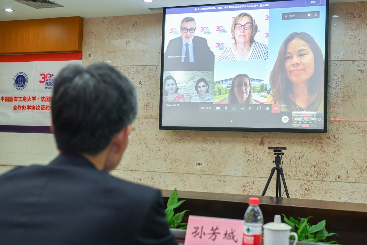 2022年6月18日下午,在学校隆重庆祝建校70周年期间,bat365在线中国官网登录入口和法国雷恩商学院合作协议签约仪式以视频方式在学校厚德楼3019会议室成功举行。仪式由学校国际处处长张轶主持。学校校长孙芳城、副校长柏群,国际处负责人、国际商学院班子全体成员及相关部门负责人,雷恩商学院校长Thomas FROEHLICHER、主管副校长和国际处负责人、项目负责人等,出席了签约仪式。