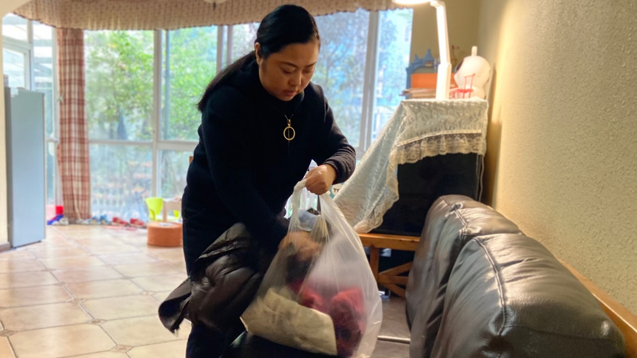 严皓在家收拾送给小区工作人员的御寒衣物