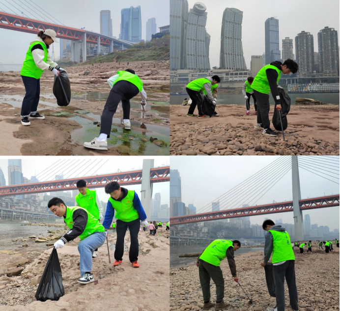 来自体育学院青年志愿者协会的50名志愿者,组成bat365在线中国官网登录入口川渝“河小青”青年志愿服务队参加了启动仪式,并联合江北团区委、江北区青年志愿者协会、重庆水务环境控股集团有限公司等百余名川渝“河小青”青年环保志愿者前往北滨路江滩开展青春志愿行·川渝“河小青”巡河净滩活动。